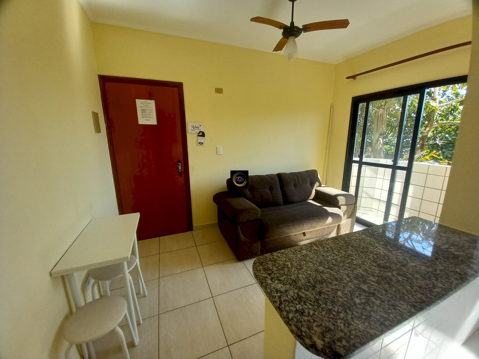 LINDO APARTAMENTO COM 1 DORMITÓRIO A 180 METROS DA PRAIA. SALA COM SACADA VISTA PARA A MONTANHA.