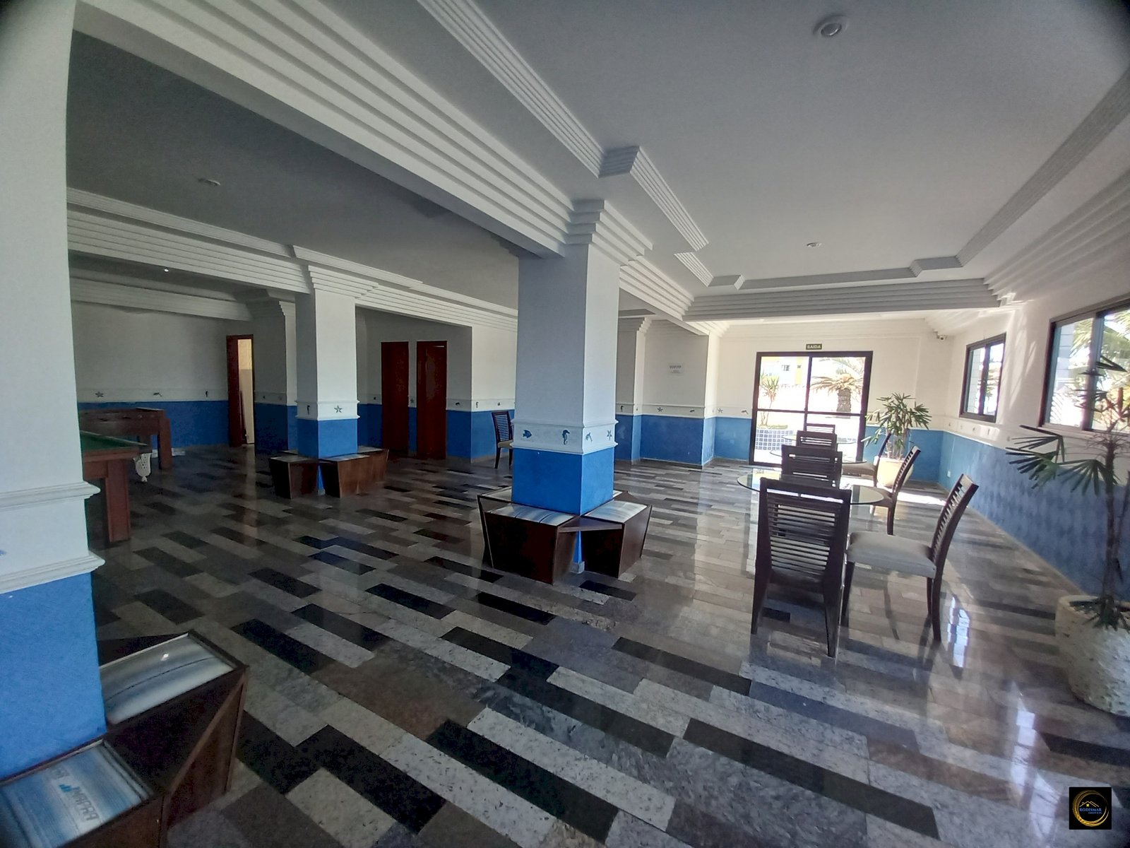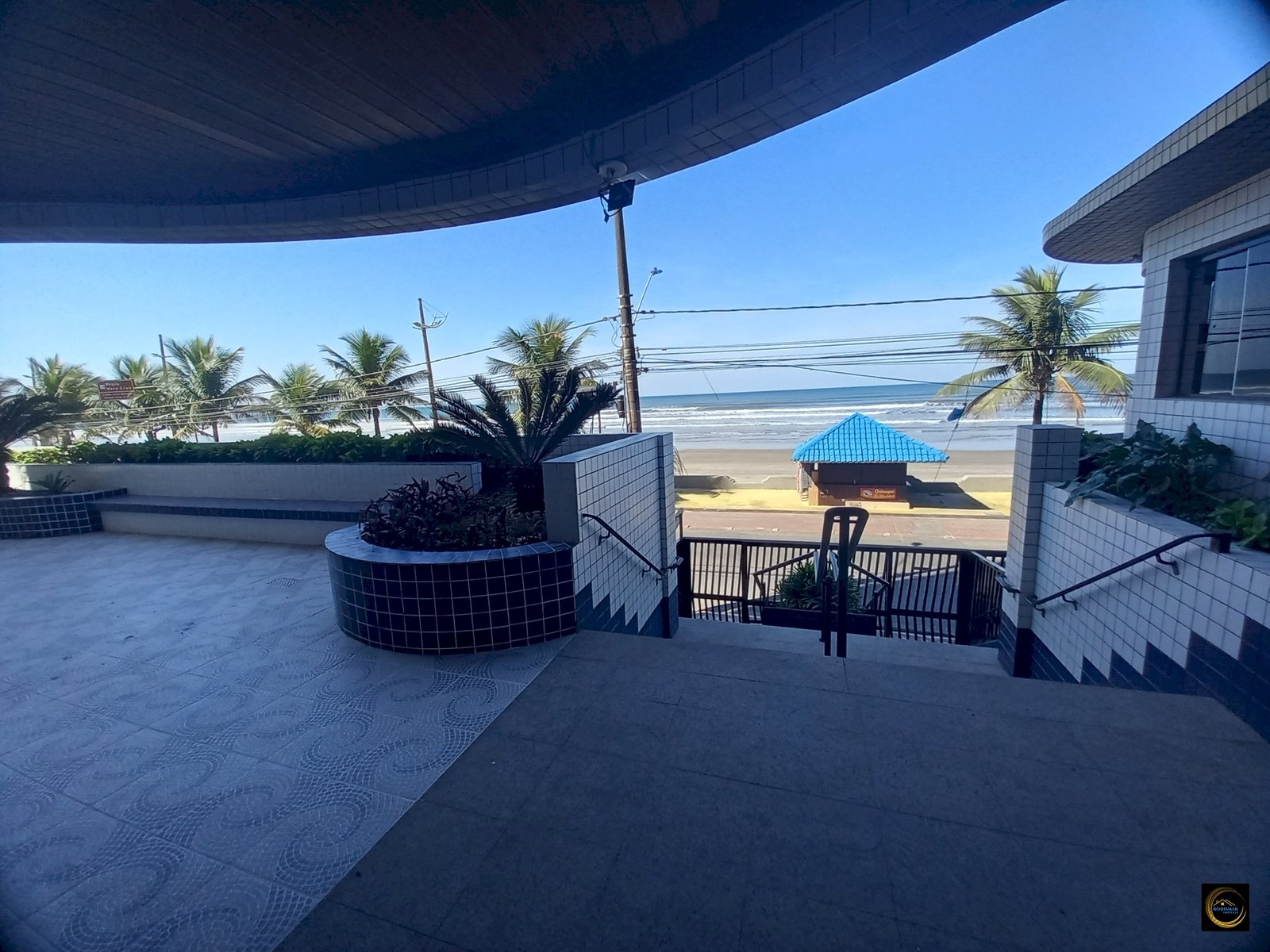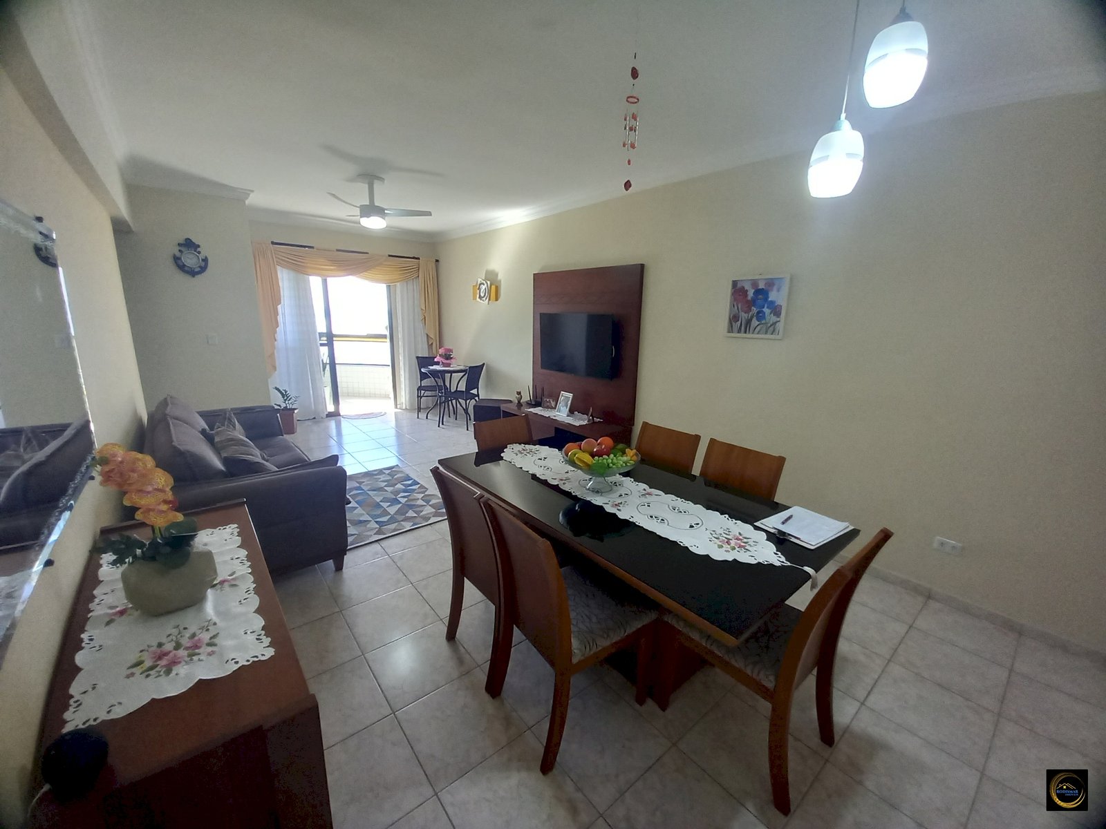 Sala grande com sacada vista para o mar.
