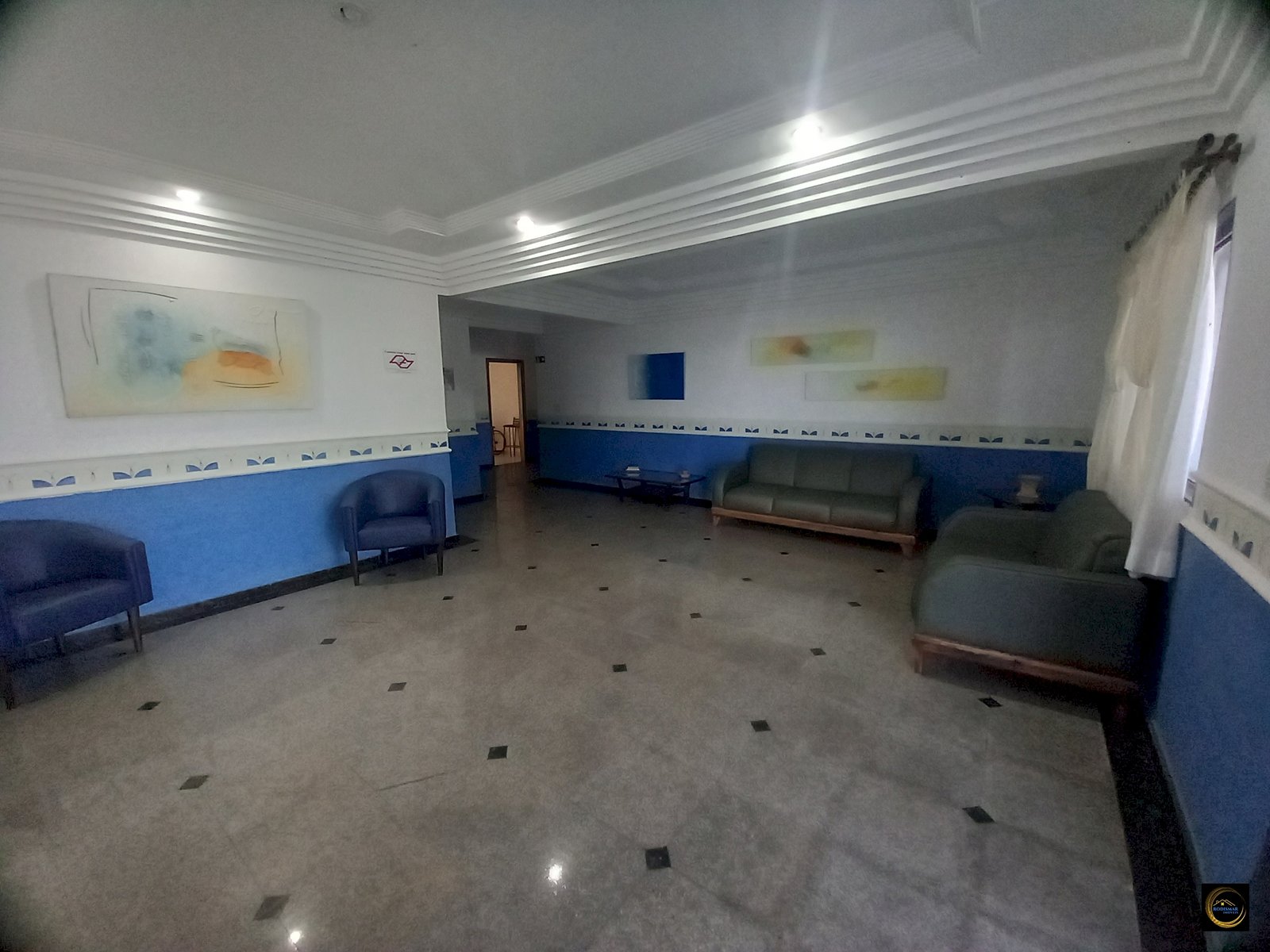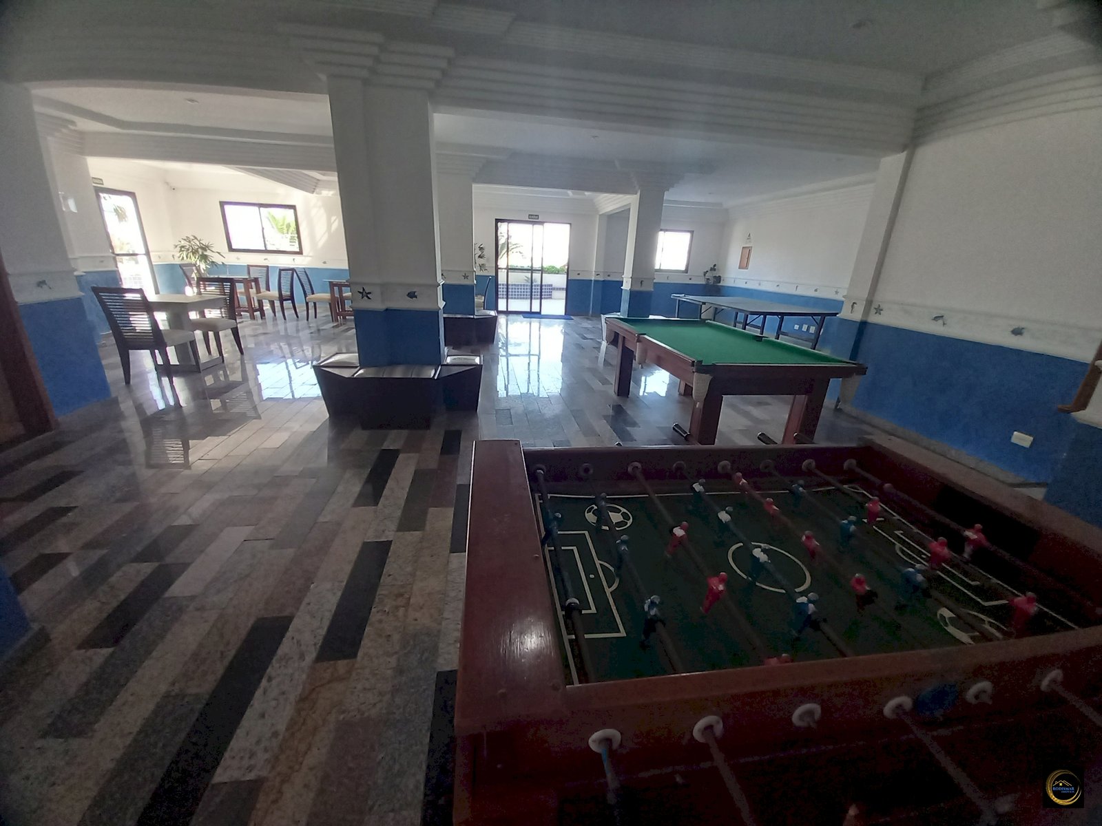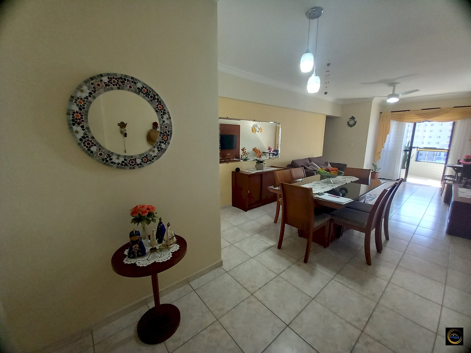Sala grande com sacada vista para o mar.