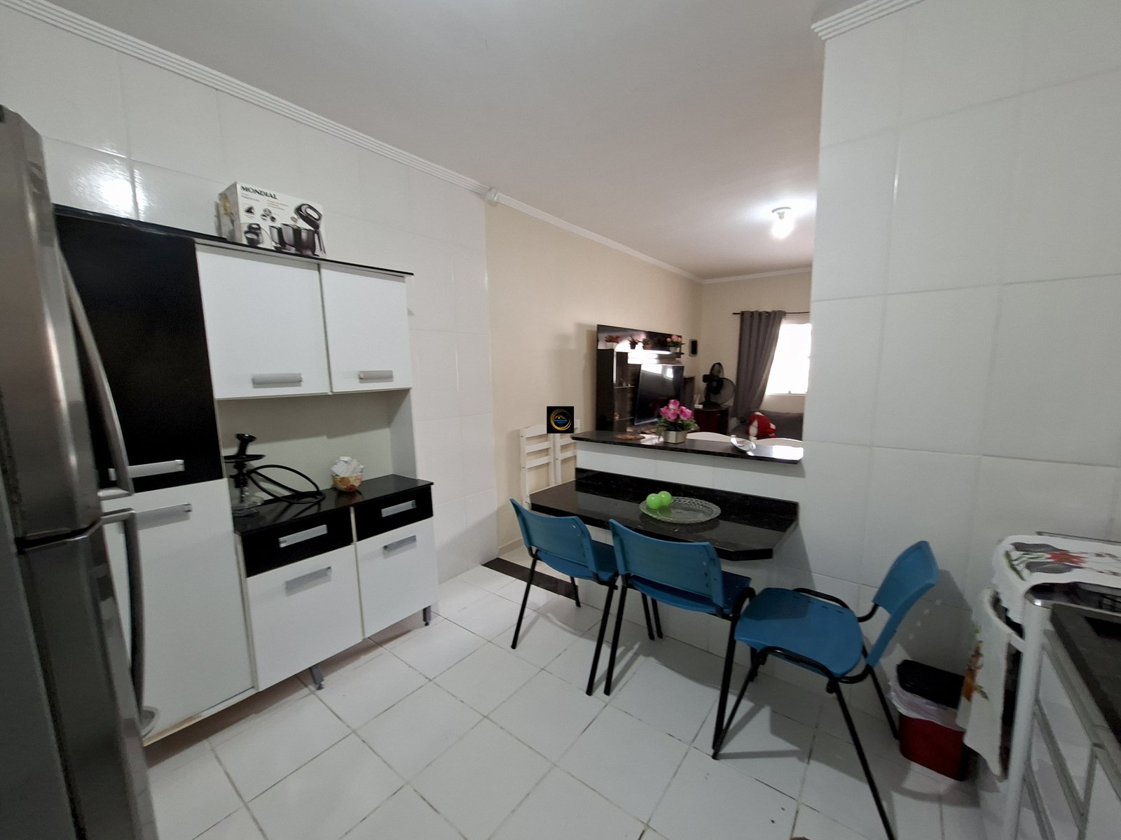 SALA, COZINHA AMERICANA, BANHEIRO SOCIAL E ÁREA DE SERVIÇO.